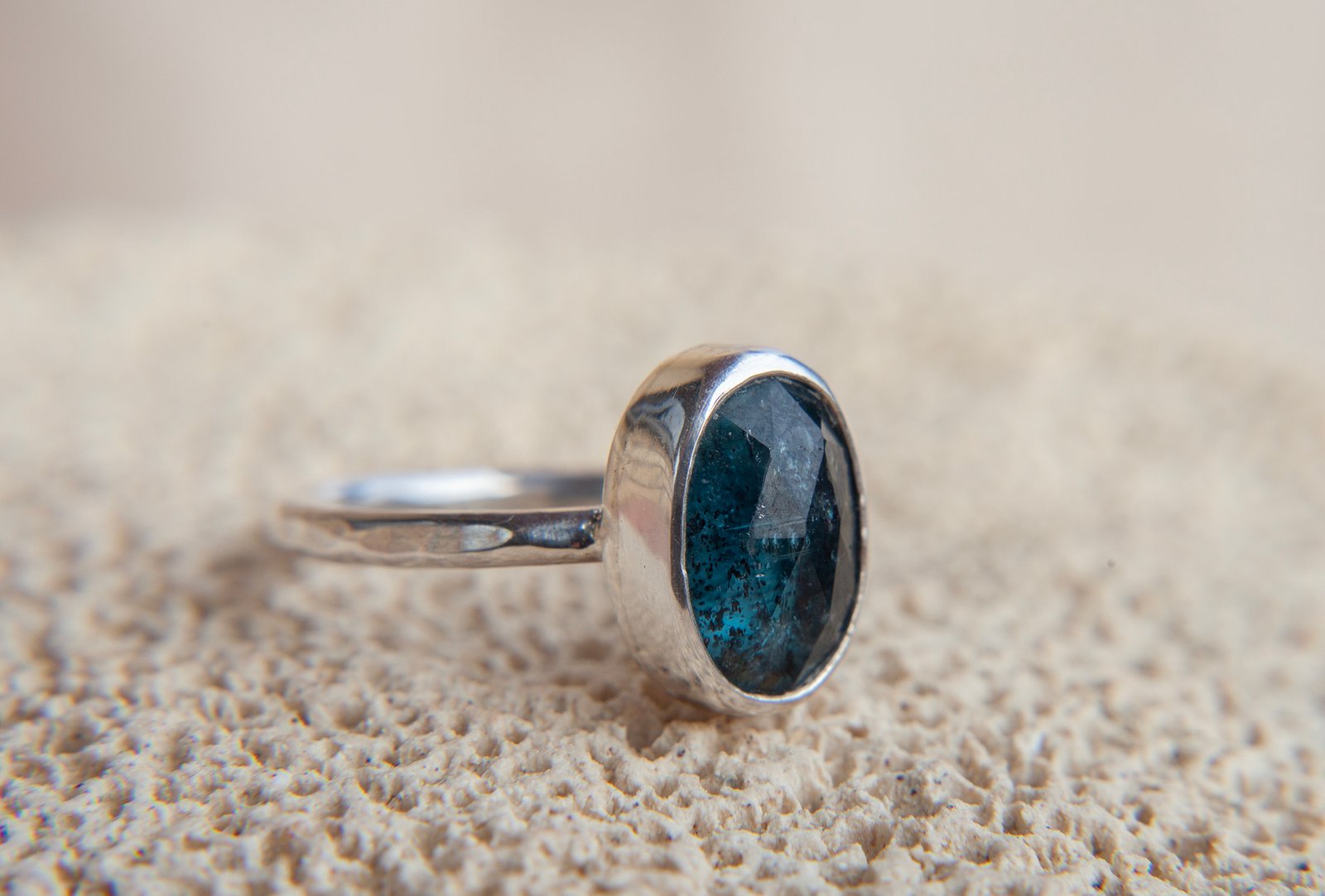 Ručno izrađeni srebrni prsten sa kijanit mossom kombinira srebro 925 i čisto srebro 999. Svaki komad nakita izrađen je pažljivo ručnom izradom, što ga čini potpuno jedinstvenim.